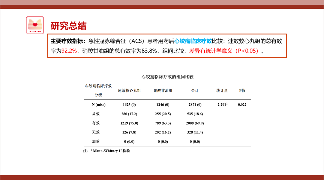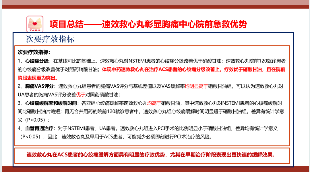 何萍医生在报告中总结指出,本研究为在ACS院前阶段应用中医药的探索积累了真实世界数据。该研究响应了关于深化中药现代研究的学术号召,其初步结果对探索中西医结合在胸痛中心建设,尤其是在急危重症场景下的协同模式,具有一定的参考意义。
